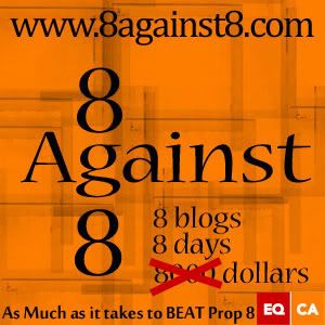 8 Against 8, an effort by eight lesbian bloggers to raise $8,000 in 8 days for the No On 8 campaign has surpassed our $8,000 goal - we could break $10,000 today with your help! My fellow bloggers on this project are: