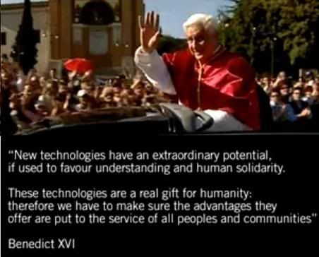 The latest attempt to bring the Catholic Church into the modern age (after admitting the earth revolves around the sun) is the big debut of Pope Benedict on YouTube -- his own online Vatican propaganda channel to reach out to the peeps. However, the ultimate reason for this is image control -- and the Vatican admits it.Pope Benedict XVI joined U.S. President Barack Obama and Queen Elizabeth II on Friday by launching his own YouTube channel, the latest Vatican effort to reach out to the digital generation.Watch the thrilling introduction (embedding was disabled -- so much for making the Papal activities go viral). I put together a couple of screen shots....Benedict also warned that virtual socializing had its risks, saying "obsessive" online networking could isolate people from real social interaction and broaden the digital divide by further marginalizing people.